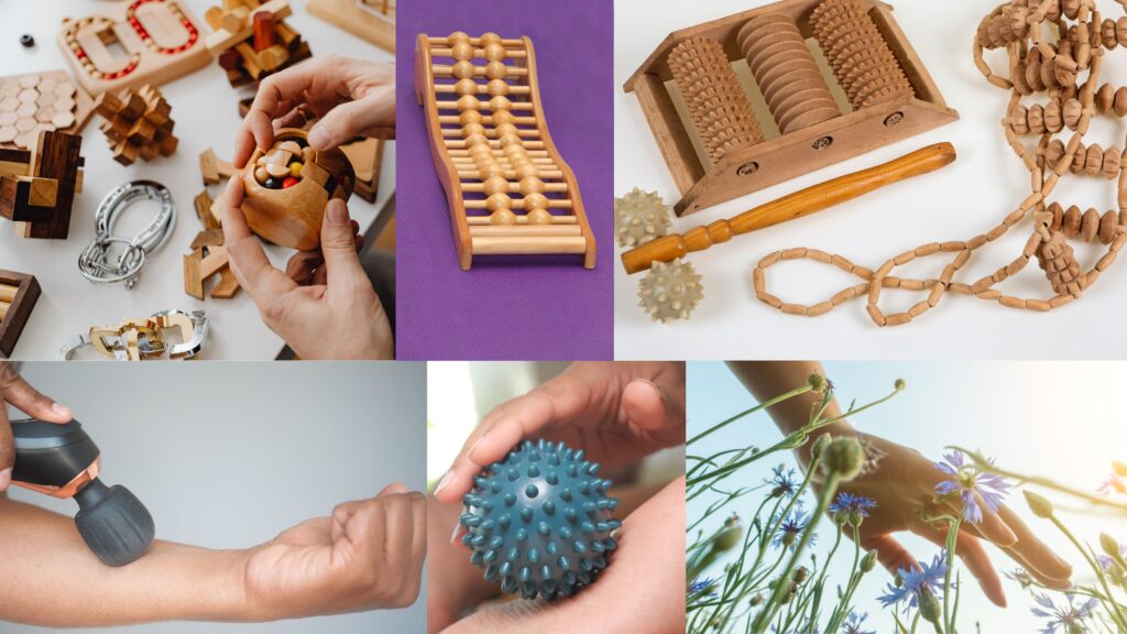 - تمرير الأصابع على أسطح مختلفة لتحفيز الأعصاب الطرفية.