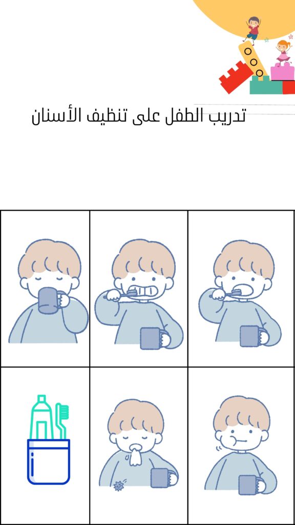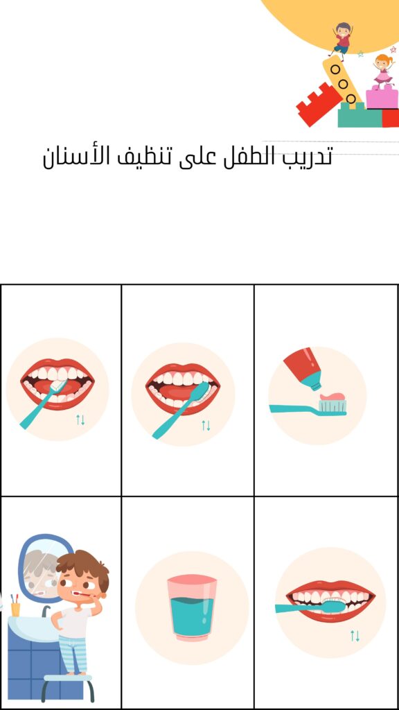 • استخدام بطاقات أو صور متسلسلة توضح خطوات التفريش: